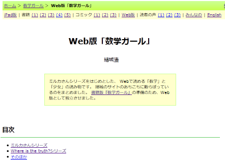 書籍『数学ガール』のもとになった、Web小篇「ミルカさん」をはじめとした、 Webで読める「数学」と「少女」の読み物です。 結城のサイトのあちこちに散らばっているのをまとめました。